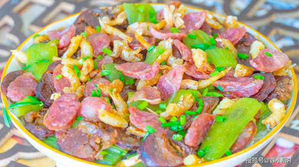 7、最後簡單調個味兒,加生抽、香油就夠瞭,香腸和蝦仁兒、還有生抽都是咸的,鹽就不用加瞭。