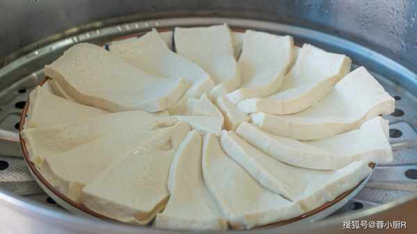 2、起鍋燒水,水開上汽後放入豆腐大火蒸5分鐘,蒸好後倒掉豆腐裡面多餘的水。