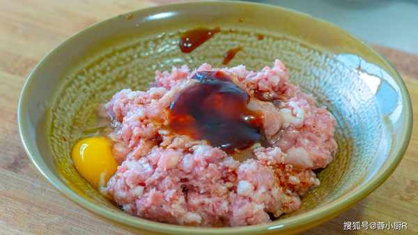 5、這時候我們給肉餡兒來簡單地調個味兒,鹽、蠔油、生抽,再來一個雞蛋,接著朝著一個方向攪打上勁。