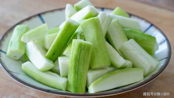 3、絲瓜兩條,去皮後切小段,對半切開後再對半切開,切成這種小長條就可以瞭。怕氧化變黑的可以加清水泡著,馬上就能做的話就不用瞭。