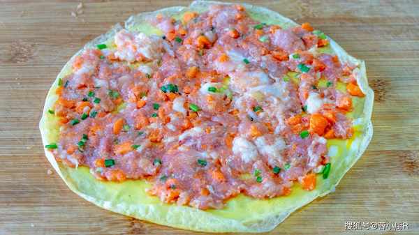 11、接著取一張蛋皮,中間放上一大勺肉餡兒,先鋪平整,邊邊上留點空隙,不要都鋪滿瞭,然後在空隙上刷上一層蛋液。
