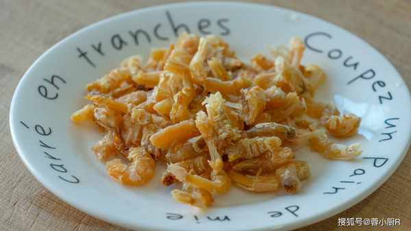 2、幹蝦仁一把,也用溫水泡一泡。小蝦仁泡好瞭不用處理,個頭大一點的泡好後可以用剪刀剪小一點。蝦仁在這裡主要是提鮮的。