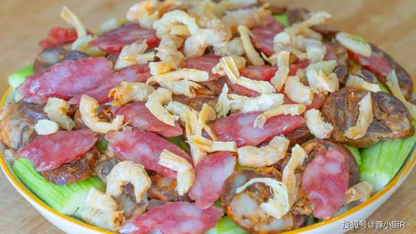 6、接著我們準備一個盤子,先鋪上泡好的粉絲再放上絲瓜、香腸、幹蝦仁。