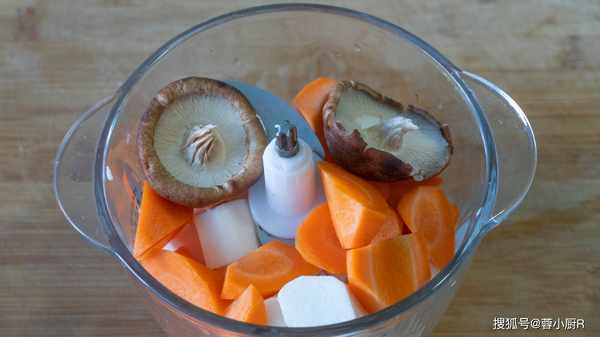 4、和山藥一起倒入絞肉機裡面,再加2個洗凈的香菇,一起打成細膩的蔬菜泥。