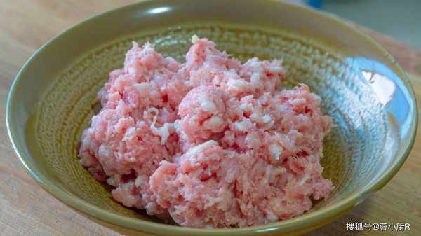 2、接著準備1斤半豬肉,洗凈後改刀切小塊兒,裝入絞肉機裡面後打成肉泥,可以多打幾秒,肉質細膩口感會更好吃,打好後先倒出來備用。