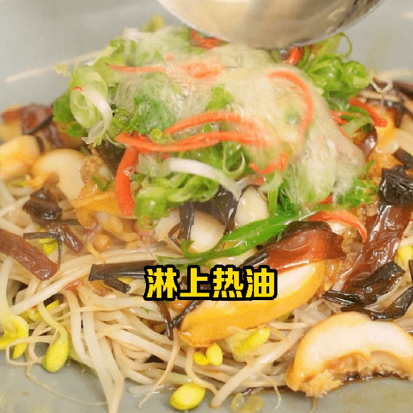 4、然後鍋中燒一鍋開水,放少許鹽和廚邦特香純花生油,把黃豆芽焯水2分鐘盛出,再放入鮑魚焯水30秒,撈起放在黃豆芽上面,然後把蔥油均勻加入菜裡,最後來一勺熱油,哇,這個香味瞬間爆發!