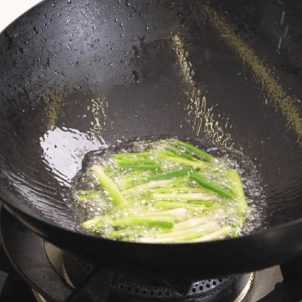 2、開始熬制蔥油,熱鍋加入廚邦特香純花生油,油要多放一些。先放蔥白爆出香味,蔥白變成金黃色後再加上蔥葉,微微變幹就可以瞭。註意火候,要用小火慢炸,這樣蔥油才不會有焦味。