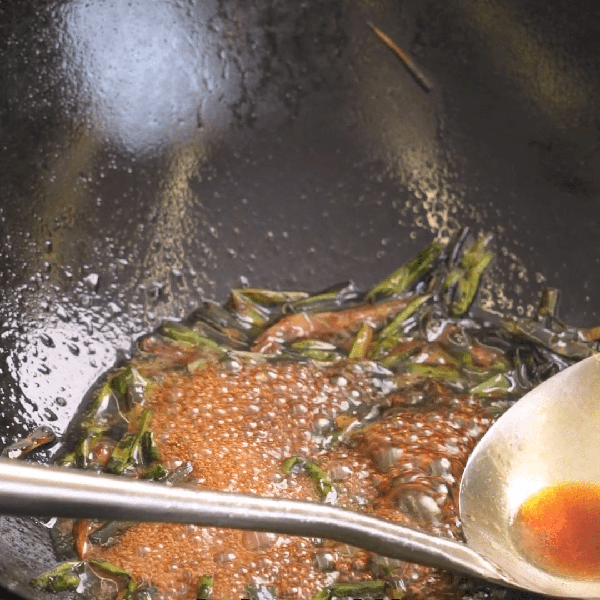 3、蔥油裡加入一大勺廚邦蒸魚豉油、半碗水、2顆冰糖,小火熬制5分鐘就可以盛出備用
