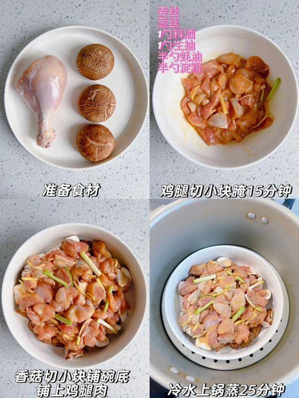 首先,準備好所需食材,包括去皮雞腿和香菇。將雞腿切成小塊,並用薑絲、蔥絲、料酒、生抽、蠔油、淀粉等醃制15分鐘。接下來,將香菇切成小塊鋪在碗底,然後鋪上醃好的雞腿肉。最後,將碗放入蒸鍋中蒸25分鐘即可。