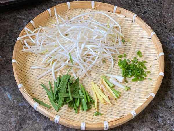 [1] 豆芽摘去根部,韭菜切長段,薑切絲,蔥切蔥花。