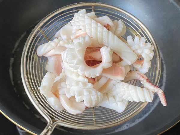 [5] 水開後,下薑絲,倒入魷魚,焯水1分鐘左右,撈出瀝幹水分。