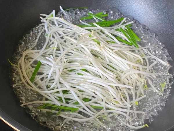 [4] 水開後,加1勺鹽、1勺油,倒入豆芽、韭菜,煮熟撈出裝盤。