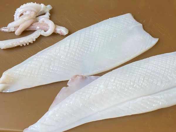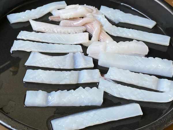 [2] 將魷魚處理幹凈,撕掉魷魚皮,切成十字花刀。