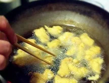 5.中火將肉塊炸上色撈出,肉塊放入鍋中可能會粘連,等到外殼硬瞭以後用筷子一劃就開瞭。金黃色時即可撈起食用。