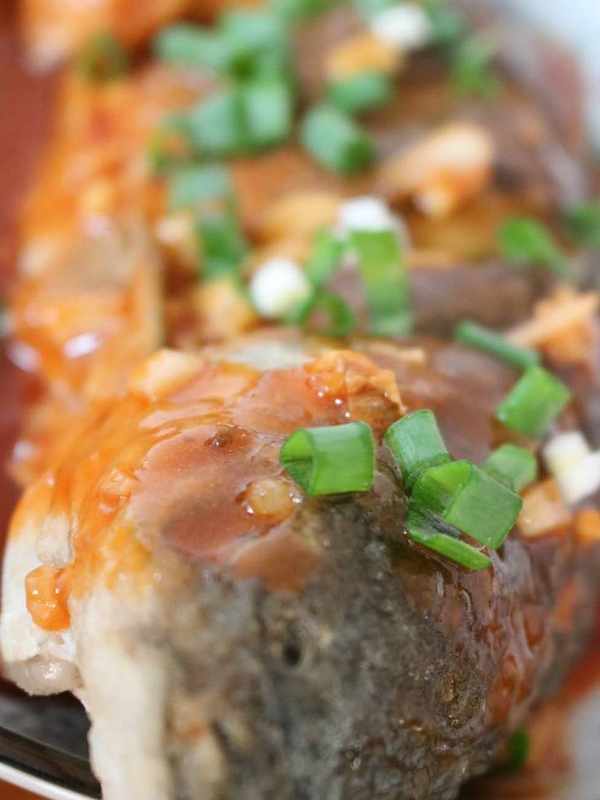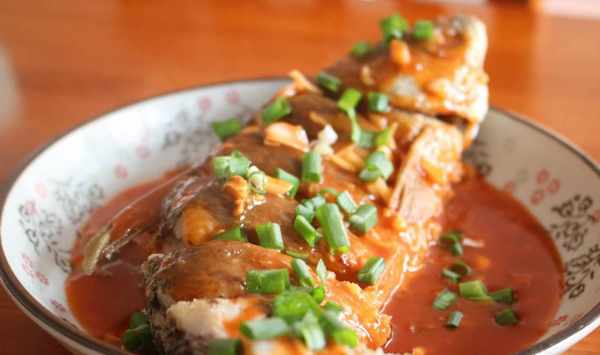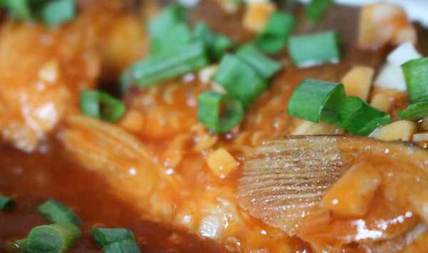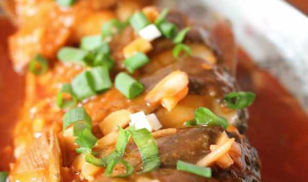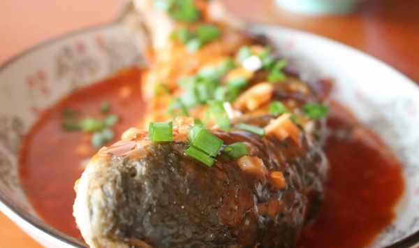 7、糖醋汁煮沸後,倒入水淀粉勾芡至濃稠後澆淋於草魚表面,並撒上蔥花即可。