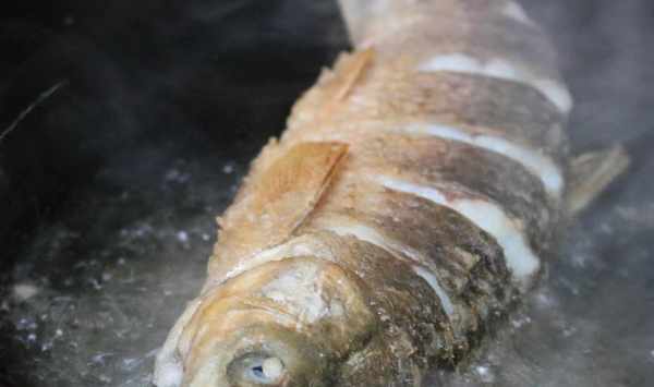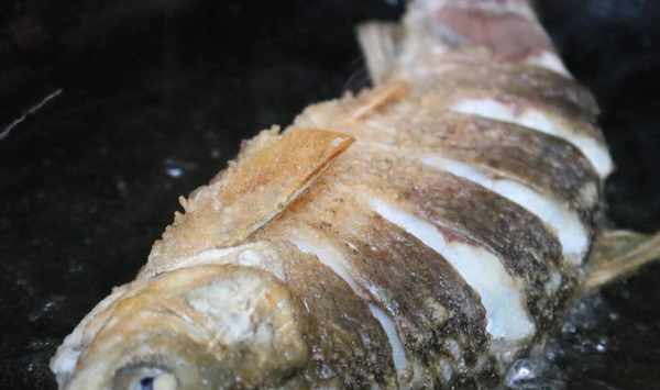 5、將草魚放入鍋內,煎至金黃酥脆後翻面繼續煎,煎至草魚兩面金黃後出鍋裝盤。