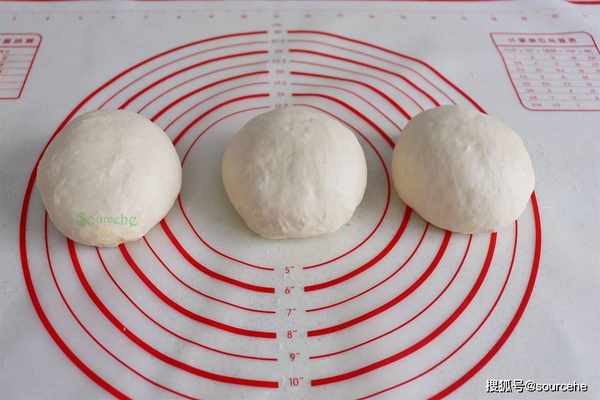 步驟3:取出面團、揉搓、排氣,面團的空氣全部排出,把面團分成3份,揉圓,放在室內發酵15分鐘。