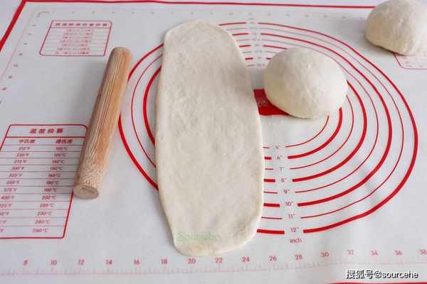 步驟4:取一個面團,用搟面杖搟成長條狀面片,寬度和吐司模具的寬一致,或者短一點點,不能大於模具寬度哦。