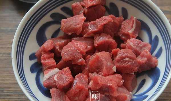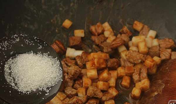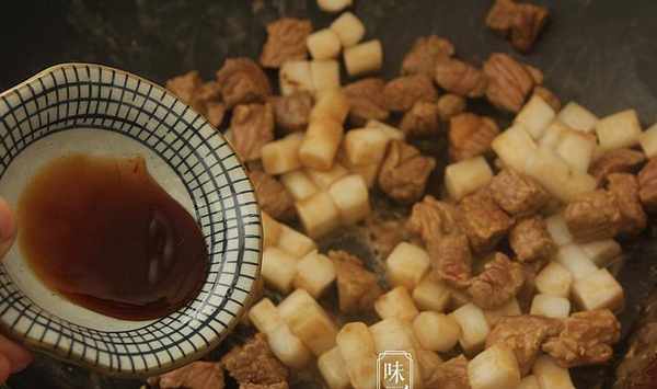 5、熱鍋放油,6成油溫後倒入醃制好的牛肉粒翻炒變色;
