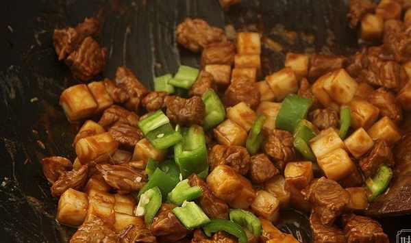9、最後青紅椒切丁,然後放進去翻炒一會兒即可;