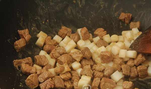 6、牛肉變色後倒入年糕進行煸炒,放少許水防止黏鍋;
