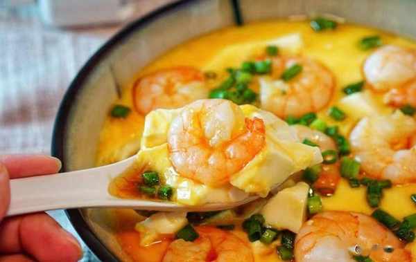 2、雞蛋打散,加50g水攪勻,倒入豆腐,蒙上保鮮膜,蒸鍋裡的水燒開後,放入雞蛋中火蒸10分鐘。揭開保鮮膜,擺上蝦仁大火蒸2分鐘,到蝦仁蒸熟蛋液凝固後關火