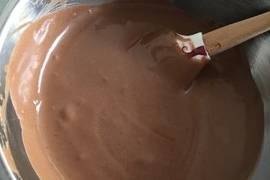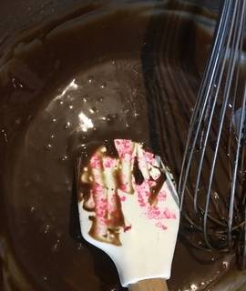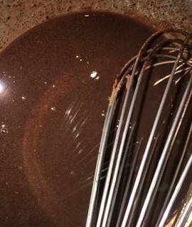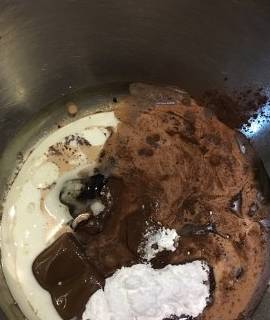 稱取15克可可粉,33克巧克力,15克糖粉,70克牛奶,40克玉米油,1克鹽,隔水小火加熱,邊加熱邊攪拌至巧克力融化,非常順滑的狀態。