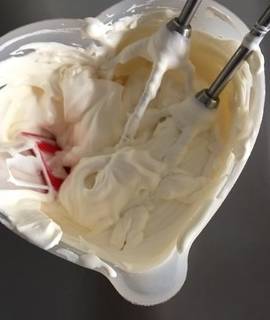150克淡奶油加15克焦糖醬或細砂糖打發到奶油不流動,足夠硬的狀態。我今天打得軟瞭一些(≧▽≦)