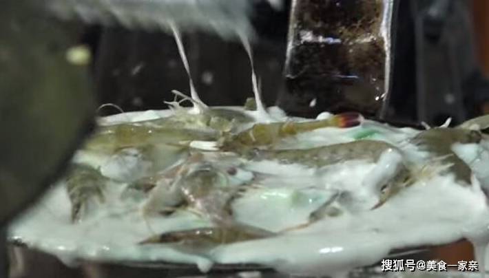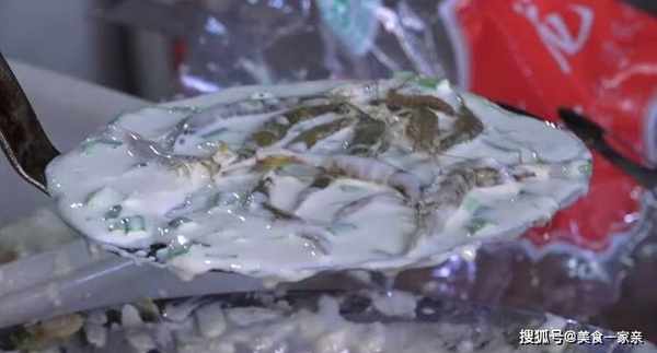 女子的小攤上有一盆調均勻的面糊,還有一盆清洗幹凈的蝦,一個幹凈的油鍋,女子拿瞭一個平底勺子,往裡面舀入一些面糊,再放瞭許多的蝦,分量挺足,一個餅差不多有10幾個蝦。