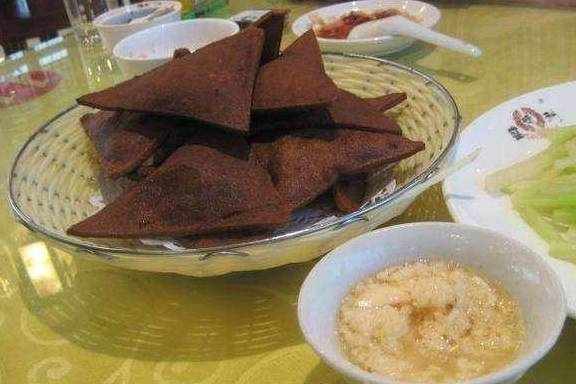 看著黑乎乎的是不是沒有食欲瞭,這東西叫血糕,是安陽的名吃,血糕蕎麥面、豬血佐以其它配料蒸制成糕,然後切片油炸,抹上蒜汁後食用。相傳血糕創制於清乾隆年間。