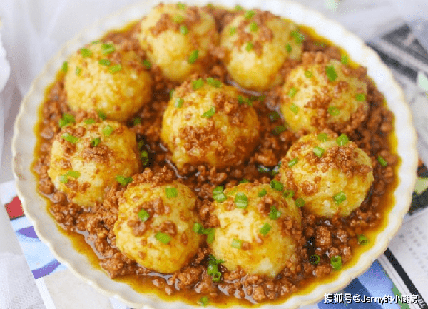 最後將肉末澆在土豆球上,這道菜就做好瞭,好看又好吃,孩子見到瞭保準喜歡。