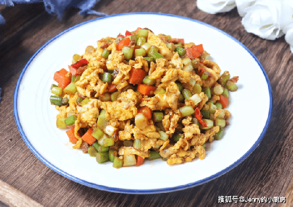 最後倒入雞蛋快速翻炒片刻,就可以出鍋瞭 。這道菜配米飯、面條、饅頭都好吃,太香瞭。不喜歡切丁的話,可以將蒜薹切成段,胡蘿卜切成絲,同樣好吃。