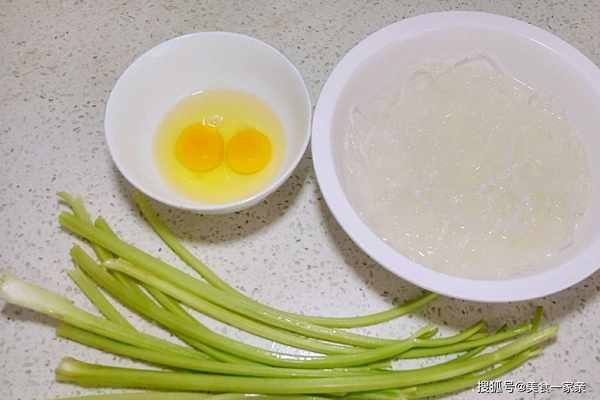 1把芹菜摘去根和葉洗幹凈,兩個雞蛋打進碗裡,凍粉提前泡發好!