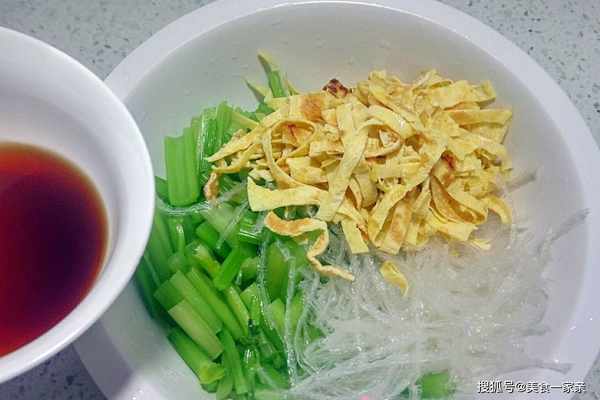 7把芹菜雞蛋皮凍粉放入盆中,加入醋鹽味精香油,拌均勻,裝盤即可!