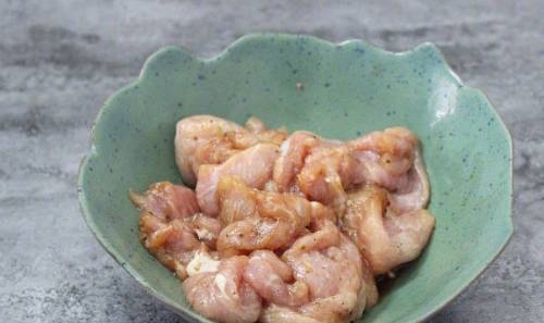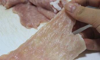 裡脊肉洗凈切成5毫米左右厚度的薄片。可用小錘給肉捶打一下,口感會更好