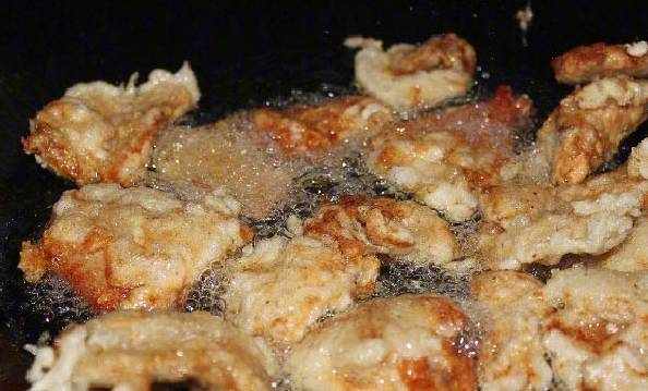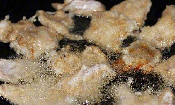 起油鍋,油熱後轉小火,將豬肉過一次水淀粉,一片一片的下鍋。慢慢炸至變硬即可撈出