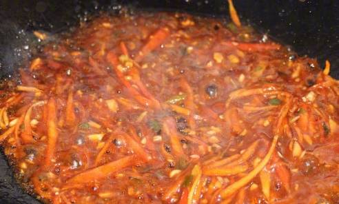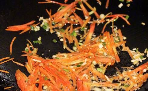 鍋內留少許底油,下蔥薑蒜爆香,再下胡蘿卜絲炒片刻