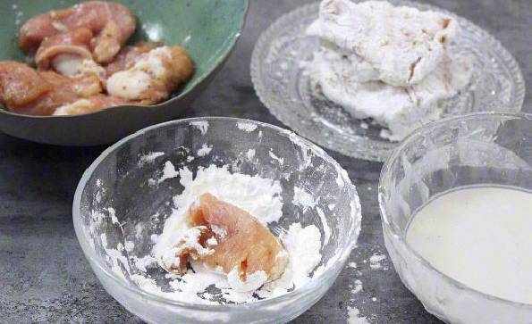 醃制好的肉先裹上一層幹淀粉,再調一碗水淀粉備用:水和淀粉比例約1:1,炸的時候再過一次水淀粉