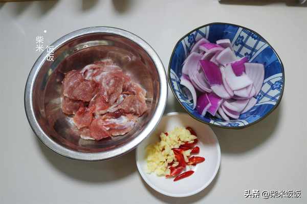 2,再準備一小塊梅花肉或者五花肉,切成薄片。洋蔥切小塊,大蒜切成末,紅辣椒切圈。