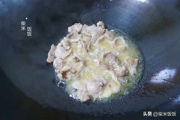 3,熱鍋倒油,油熱後放入肉片,大火快速翻炒,炒幹表面的水分。