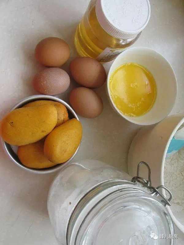 材料:低筋面粉50克,高粱粉30克,雞蛋4個,玉米油40克,牛奶70克,白糖50克,芒果適量。