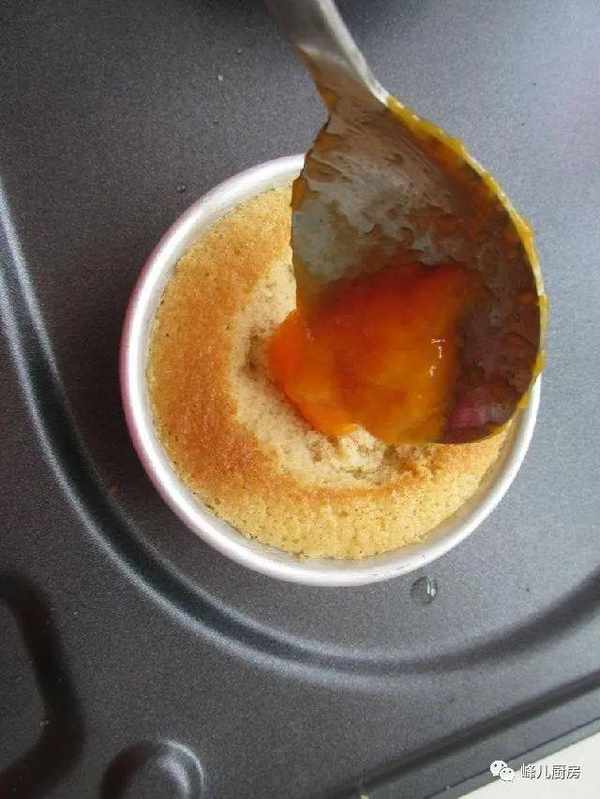10、把芒果泥用勺子舀入蛋糕的小坑中。