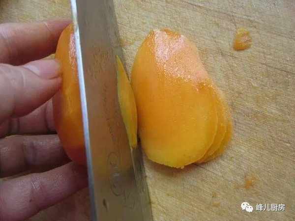 11、再把芒果切薄片。