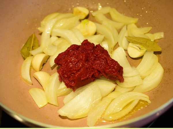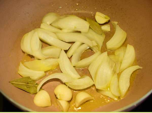 2,炒鍋燒熱,加入橄欖油,下入洋蔥、大蒜和香葉炒香
