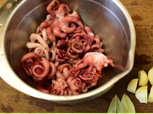 1,小章魚洗凈,去掉章魚嘴,大蒜切塊,洋蔥切塊