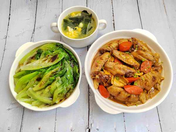 裙帶菜是我傢常備的幹貨之一,煮湯非常鮮美,口感也很好,喜歡喝湯的朋友們,可以囤上一兩包在傢裡。好久沒吃雞翅瞭,買瞭一袋雞翅,加上胡蘿卜和腐竹一起燉,吃起來非常滿足。雞翅也要記得加一些蔥結、料酒和薑片焯水,再控幹水分;鍋裡倒油,先把雞翅煎至兩面金黃,再放入胡蘿卜稍微煎一下,倒入熱開水,加入香料和調味拌勻,大火燉20分鐘;放入泡發好的腐竹,加入鹽調味,燒至湯汁濃稠時就可以出鍋瞭。燒雞翅的時候,取另一個鍋煮生菜,等雞翅出鍋時就可以開飯啦!簡單又解饞的兩菜一湯,成本約30元,四十分鐘就能搞定瞭!