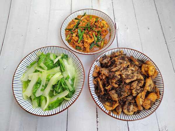 婆婆拿來的梅幹菜,實在是太香瞭,周末抽空做瞭一盤梅幹菜油豆腐蒸肉。五花肉焯水後切片,放入鍋裡煎至微黃的狀態,再放入油豆腐炒勻,加入鹽、生抽、蠔油調味,再放入洗凈的梅幹菜翻炒,出鍋裝盤後,再用蒸鍋蒸30分鐘左右就可以上桌瞭。再炒一盤開胃的蒜苗炒雞蛋和清淡的白菜,就可以開飯啦!葷素搭配的三道傢常菜,成本約20元,四十分鐘就能搞定瞭!