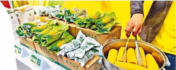 活動現場亮相的鮮食玉米、五常大米、蒲公英茶。 見習記者 唐海兵攝