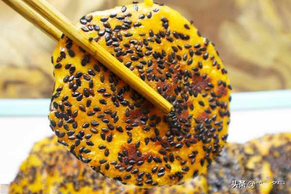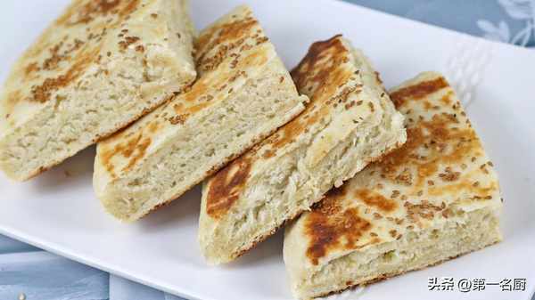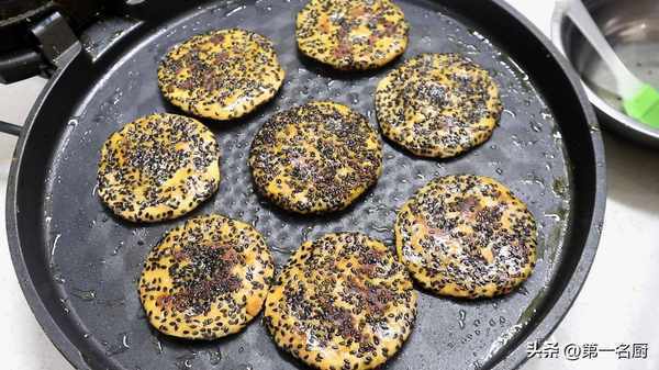 5.電餅鐺燒熱,刷上一層植物油,再把面餅攤在鍋中,撒上少許白芝麻,蓋上鍋蓋,半分鐘以後翻面,煎至一面微黃色時,再翻過來煎另一面,煎至面餅兩面金黃酥脆時,即可取出,放在案板上用刀切成四半,美味即成。