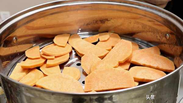 1.準備紅薯一個,洗凈後削去外皮,切成薄片,放入蒸鍋中,水開後計時連續蒸10分鐘。